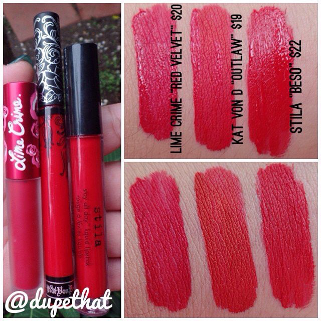 Here are swatches comparing Lime Crime "Red Velvet" next to Kat Von D "Outlaw" and Stila "Beso." Prices listed on photo. Thank you @lbcmua on Instagram for sharing these swatches with us.